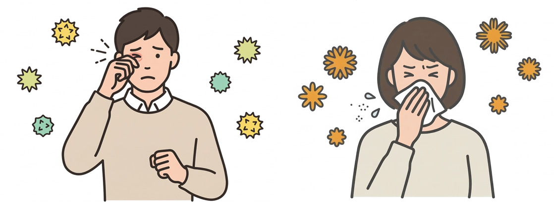 アレルギーを惹起する物質に反応して、くしゃみ、鼻水、鼻詰まり、目のかゆみといった症状を起こします。花粉に曝露されることによって引き起こされる花粉症は今では日本人の4割以上の方が罹患していると報告されています。多くはスギ花粉が原因で、特に2月から5月ごろにかけて鼻水、鼻づまり、目の痒み、咳、喉の違和感、皮膚の痒みといった様々な症状がみられます。